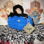 Bolso de crochet en vibrante azul francia con manijas negras tejidas.
