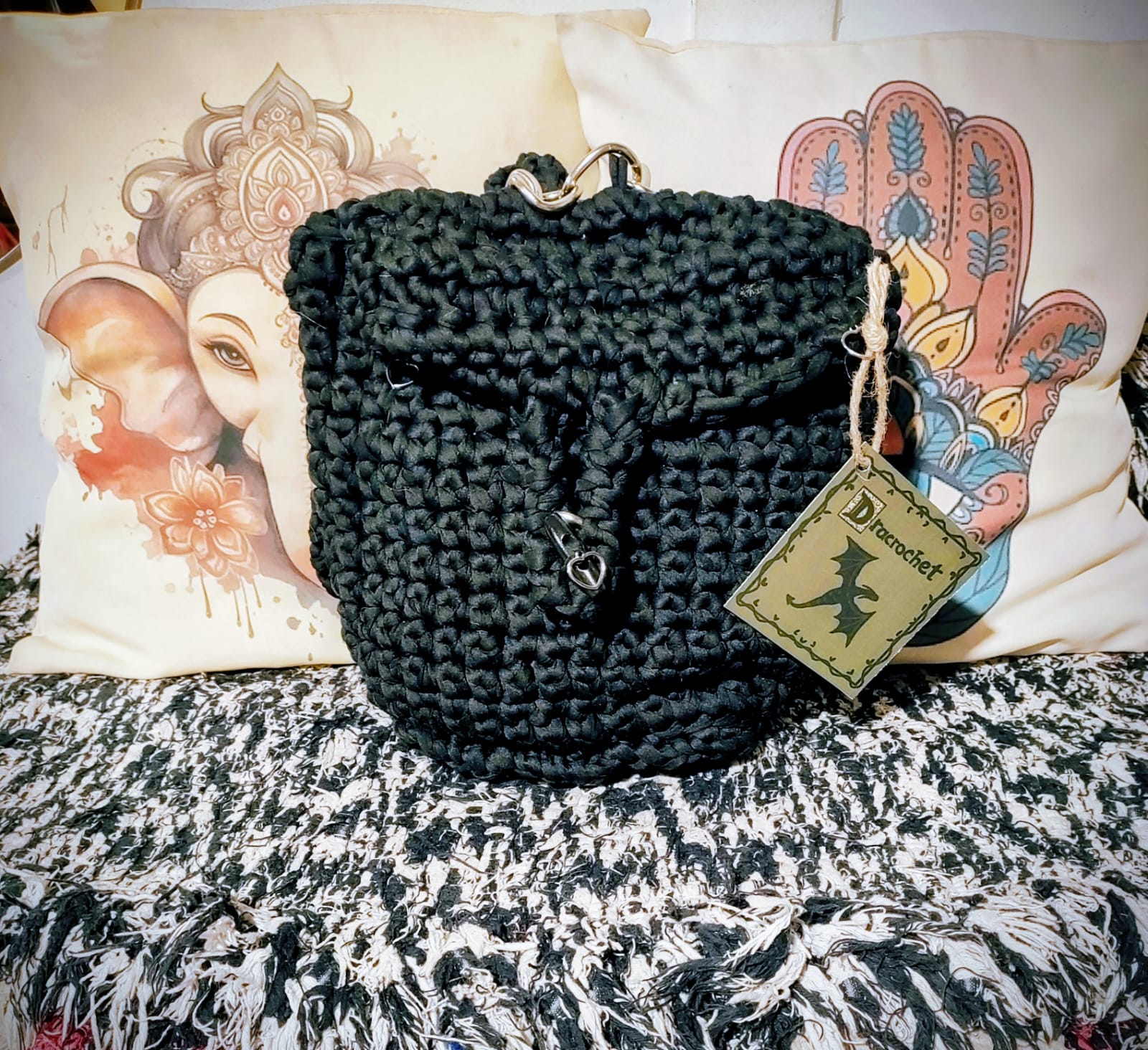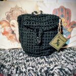 Hermoso bolso tejido a mano en crochet, color negro elegante con detalles metálicos plateados.
