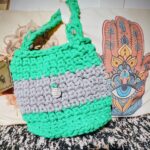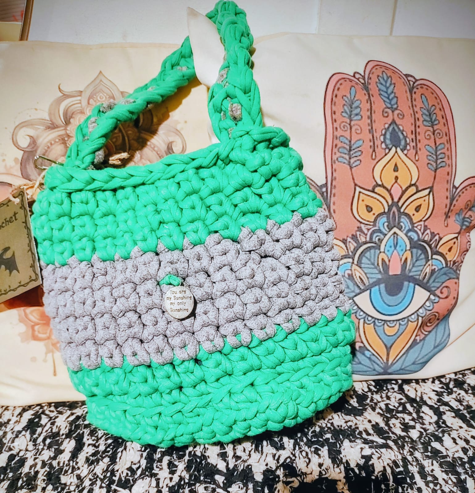 Bolso estilo bucket tejido a mano en hermosos tonos verde agua y gris.
